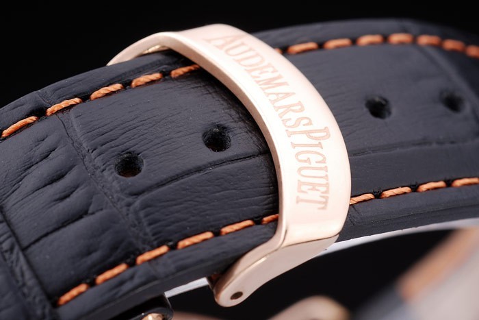 Bratara: Cureaua de piele de crocodil negru cu coasere de portocale și căldură Embossed Audemars Numele și logo-ul și un AUDEMARS Piguet inscripționat 18K trandafir-aur placat flip-over cârlig cu cârlig Clăcerea de brățară Lungime: 245 x 22 mm