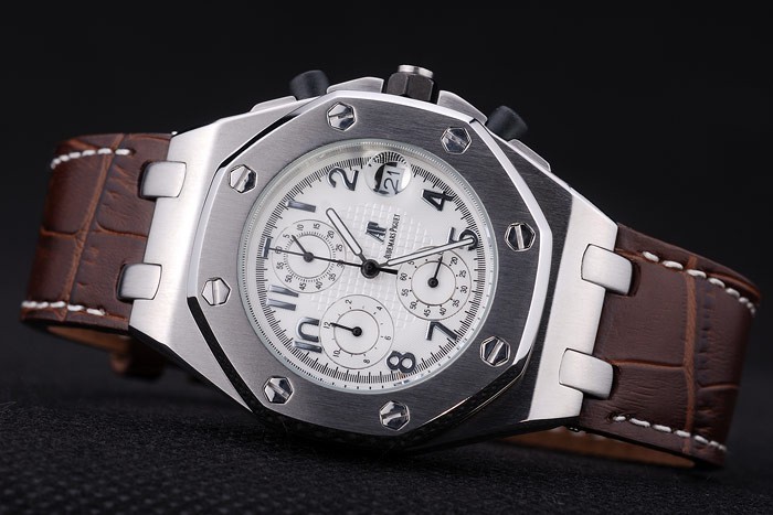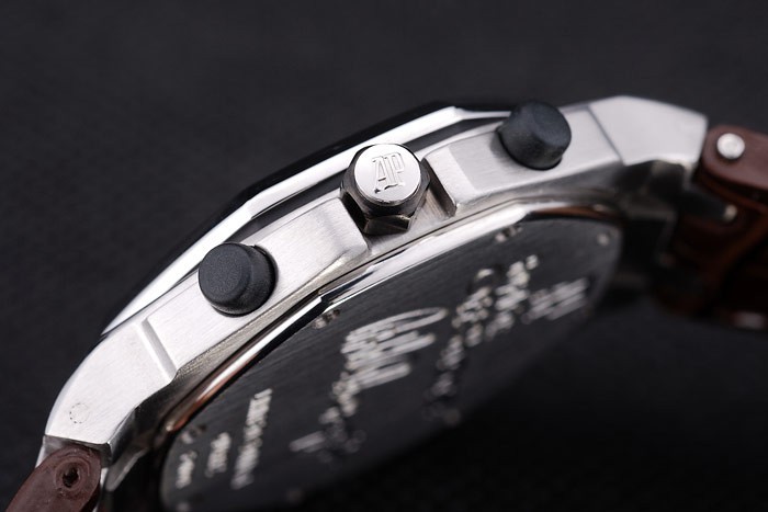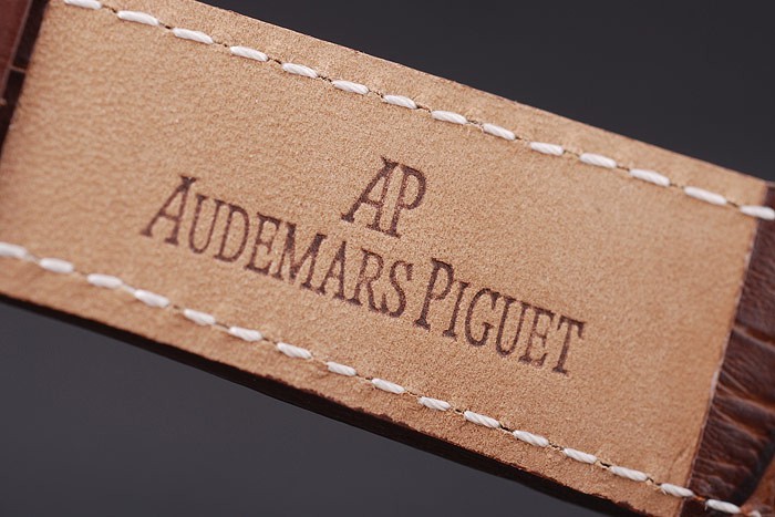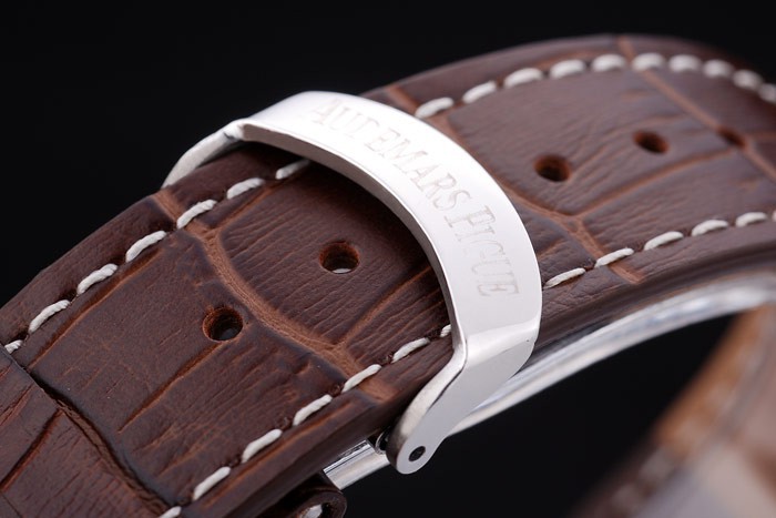 Cutie: Carcasă din oțel inoxidabil periat < Br> Bratara: cureaua de piele crocodile maro inchis cu coasere si caldura cu coasere si caldura Audemars Numele si logo-ul si un AUDEMARS Piguet inscris inoxidabil din otel inoxidabil Flip-Over Clapeta