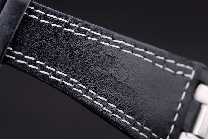 Brățară: Heat Embossed Audemars Piguet Swiss Made Logo și cureaua de piele neagră cu filet de cusut alb dublu și auudesars Gravuet Grogravete din oțel inoxidabil Clapetă