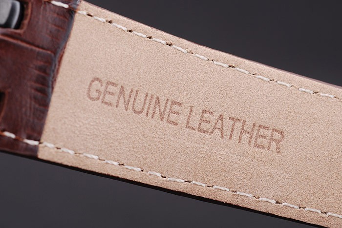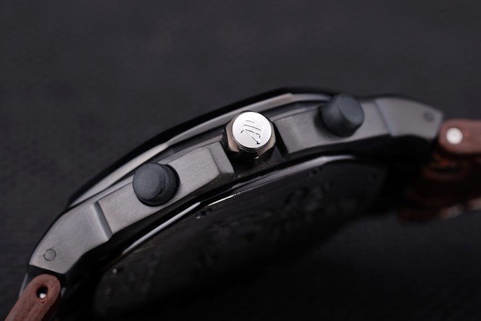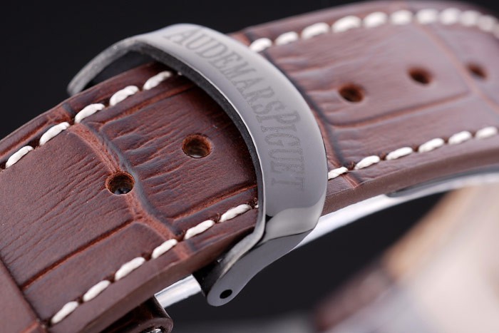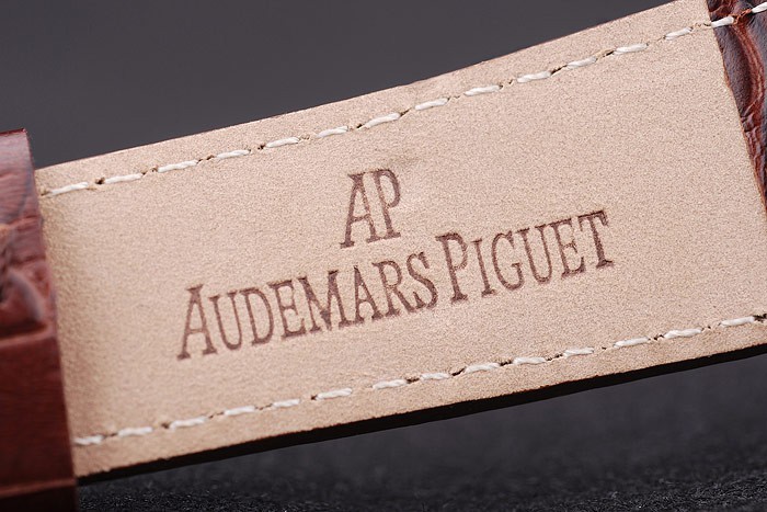 brățară: curea de piele crocodilă maro închis cu cusatura albă și căldură embossed Audemars Numele și logo-ul și un AUDEMARS Piguet inscripționat în formă de ioni înscrisă cu cârlig Clapetă