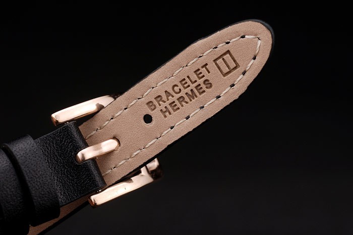 Brățară: curea de piele neagră alungită cu ștampila de căldură și Hermes Hermes brățară gravă Rose-aur placat cu cârlig Clapetă