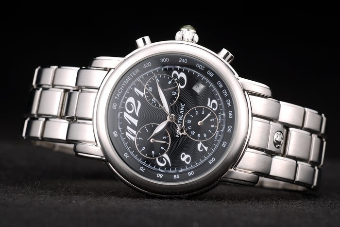 : oțel inoxidabil lustruit cutwork rotunjite coroana cu MontBlanc logo-ul și două din oțel inoxidabil lustruit împingere coroane buton de pe fiecare parte a acestuia