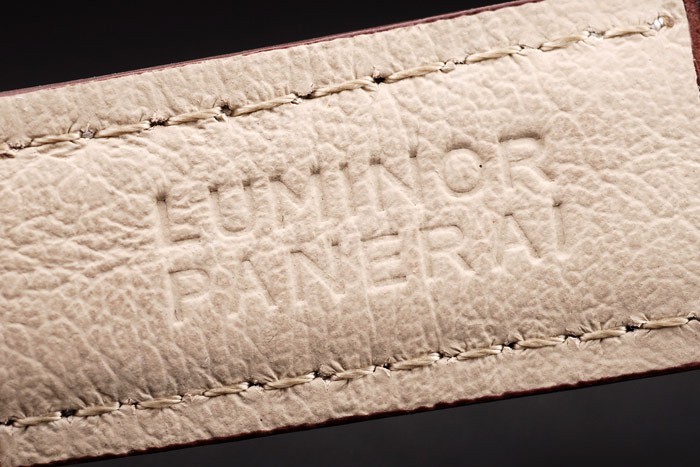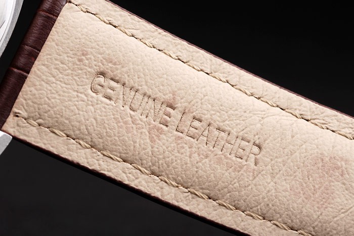brățară: curea din piele maro cu coasere albă și căldură luminor cu umilință ștampila panoului din oțel inoxidabil lustruit cu gura de gravat cu paneraluri