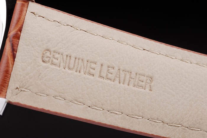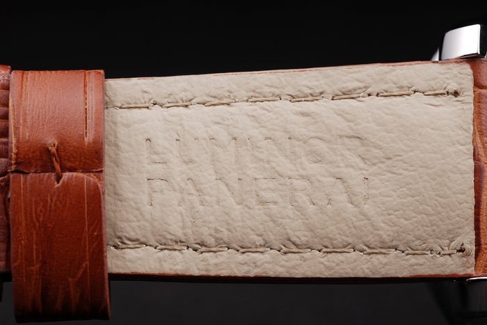 bratara: curea din piele maro cu cusaturi albe și de căldură în relief Luminor Panerai de timbru și lustruit inoxidabil cârlig din oțel incuietoare -buckle cu Panerai gravura
