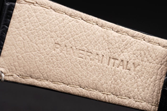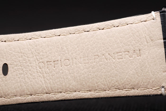 Bratara: Cureaua de piele crocodilă negru cu ateliere de cusătură albă și ateliere de căldură Panerai Italia Ștampila și cârligul de ioni Gravura panerai