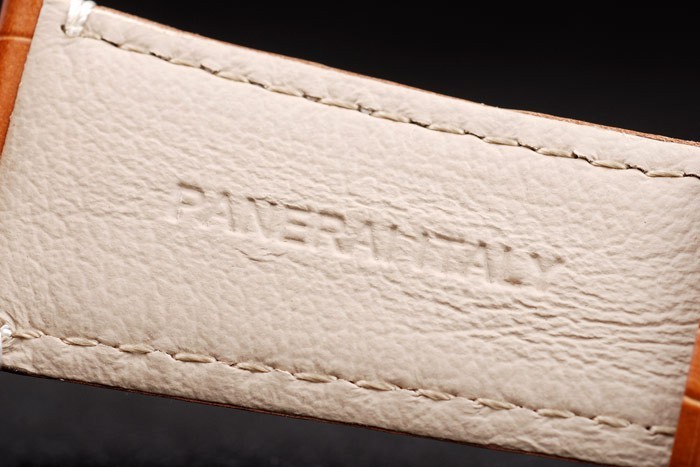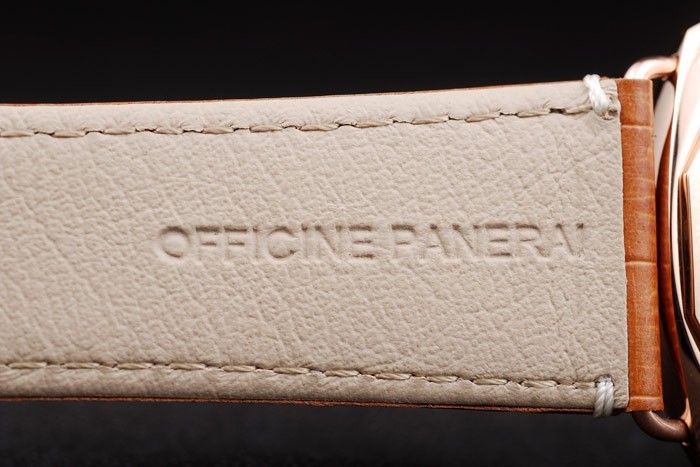 bratara: curea din piele de crocodil maro cu cusaturi albe și de căldură în relief Ateliere Panerai Italia timbru și 18k a crescut cu aur placat cu incuietoare-cârlig cataramă cu Panerai gravura