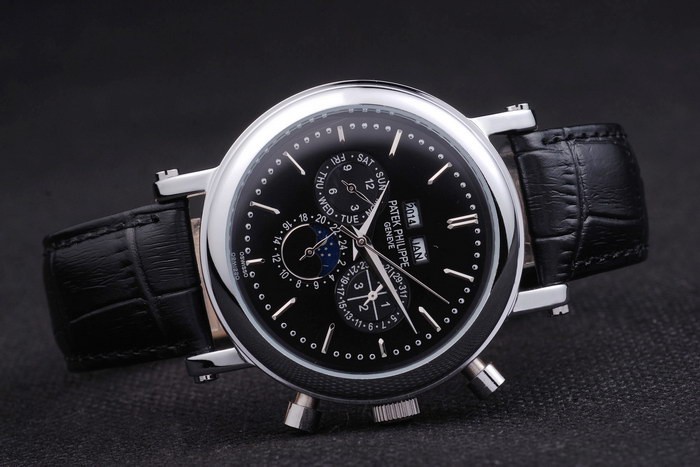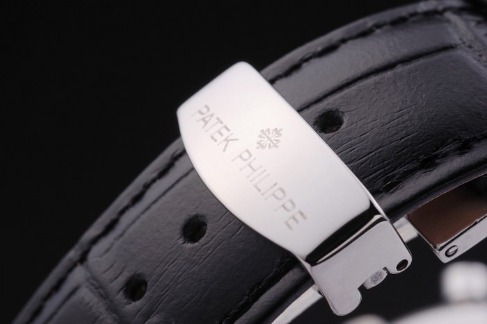 brățară: curea din piele neagră cu Patek Philippe și un timbru din oțel inoxidabil ori în agrafă
