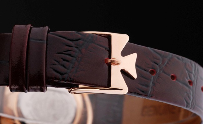 brățară: cureaua de piele de maronă bogată cu inscripția „Vacheron Constantin” și cârligul cârligului Clădire